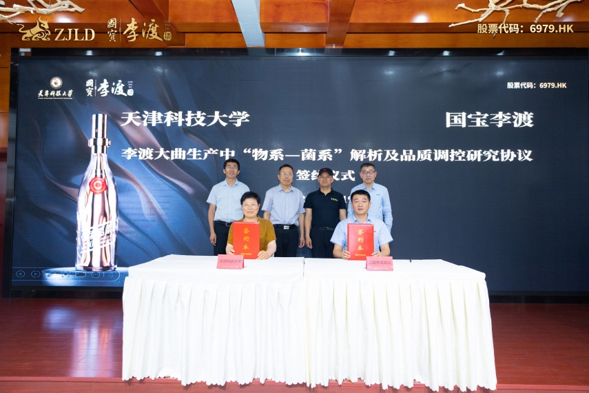 交流会上,路福平和汤向阳代表双方签署了战略合作框架协议,同时为汤向阳颁发“天津科技大学兼职博士、硕士研究生指导教师”及“天津科技大学产业教授”聘书。双方代表为“天津科技大学——国宝李渡白酒发酵技术研究中心”揭牌,签署了“李渡大曲生产中物系—菌系解析及品质调控研究”科研项目合作协议。双方以此交流为新的契机,将实现校企优势资源互补,持续推动中国酒业科技创新。