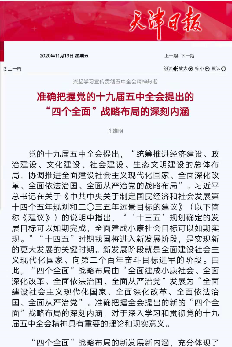11月13日,《天津日报》刊发我校教师孔维明文章《准确把握党的十九届五中全会提出的“四个全面”战略布局的深刻内涵》。文章指出,“四个全面”战略布局的新发展新内涵,充分体现了马克思主义与时俱进的理论品质;“四个全面”战略布局的新发展新内涵,充分体现了实现“两个一百年”奋斗目标、把我国建设成为社会主义现代化强国的战略部署要求;“四个全面”战略布局的新发展新内涵,充分体现了新征程上坚持不懈推进中国特色社会主义事业的坚定决心;“四个全面”战略布局的“变”与“不变”,充分体现了以习近平同志为核心的党中央擘画未来的远见卓识和继往开来的初心使命,深刻指明了今后一个时期坚持和发展中国特色社会主义的战略目标和战略举措。