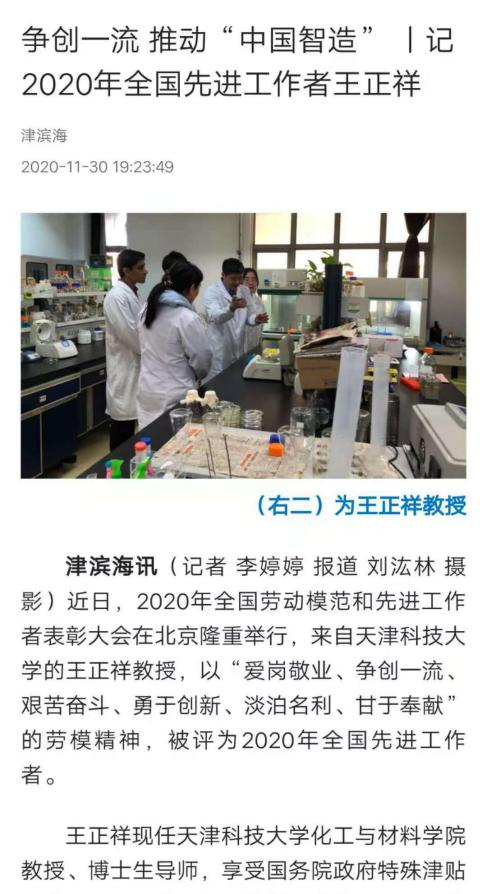 近日,《滨海新闻》、《津滨海》报道我校王正祥教授以“爱岗敬业、争创一流、艰苦奋斗、勇于创新、淡泊名利、甘于奉献”的劳模精神,被评为2020年全国先进工作者。王正祥教授在重大淀粉酶品、功能糖关键酶制剂、功能糖规模化制造技术创新与应用和乳酸单体绿色制造等方面作出了杰出贡献,推动实现该产业“中国智造”,其技术成果也获得国家技术发明二等奖和中国轻工业联合会科技发明一等奖。