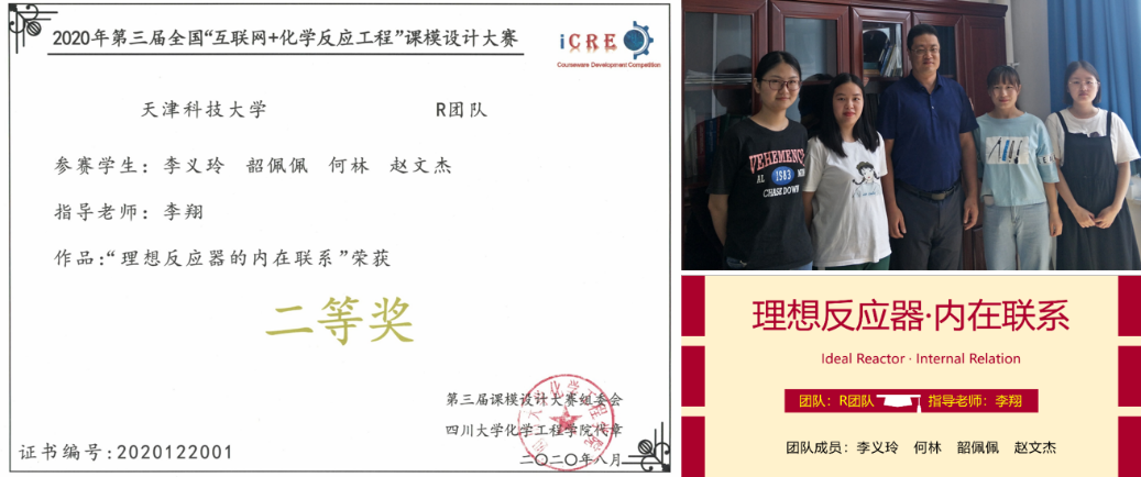 2020年8月2日,第三届全国“互联网+化学反应工程”大学生课模设计竞赛落下帷幕。我校由李翔教授指导、李义玲同学任队长,韶佩佩、何琳和赵文杰等同学组成的R团队在大赛中脱颖而出,作品《理想反应器的内在联系》获得二等奖佳绩。