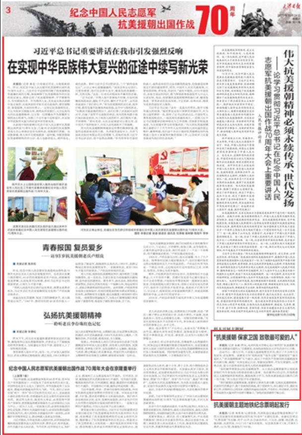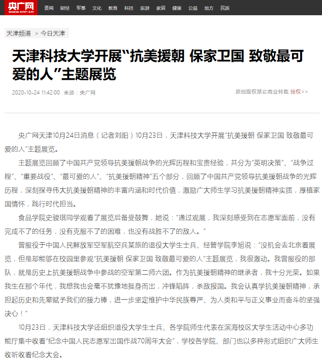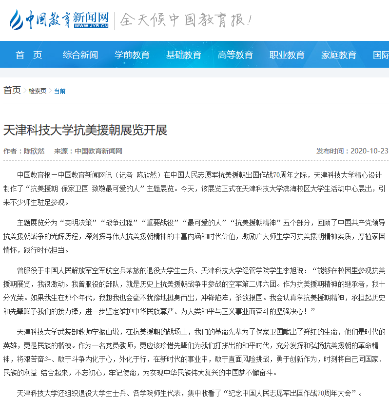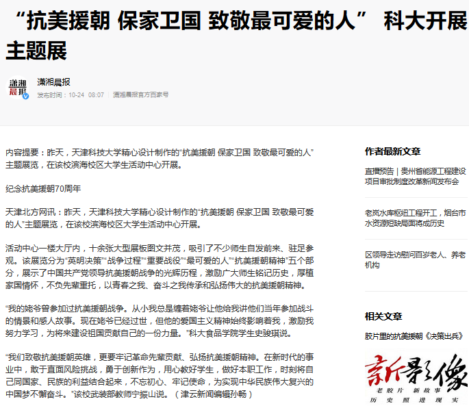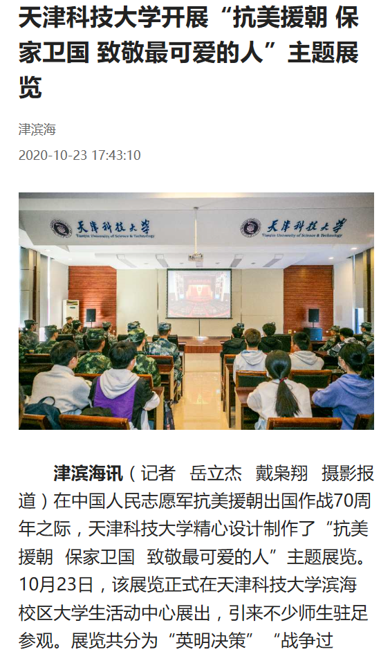 10月23日,我校在滨海校区大学生活动中心开展“抗美援朝保家卫国致敬最可爱的人主题展览,回顾了中国共产党领导抗美援朝战争的光辉历程和宝贵经验。展览共分为“英明决策”、“战争过程”、“重要战役”、“最可爱的人”、“抗美援朝精神”五个部分,回顾了中国共产党领导抗美战争的光辉历程,激励了广大师生学习抗美援朝精神实质,厚植家国情怀,践行时代担当。活动引起多家媒体关注,现将部分报道转载如下: