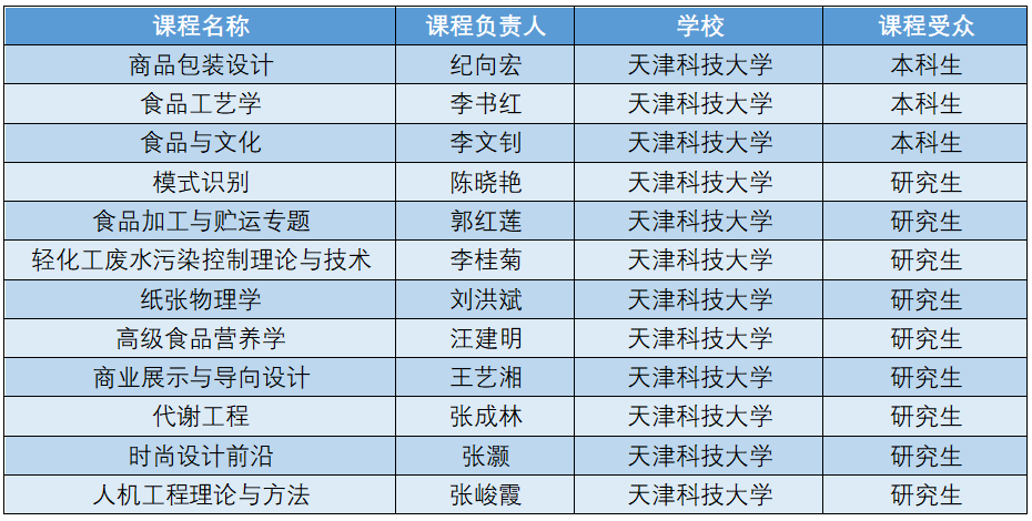本次入选的9门研究生课程分别为《模式识别》《食品加工与贮运专题》《轻化工废水污染控制理论与技术》《纸张物理学》《高级食品营养学》《商业展示与导向设计》《代谢工程》《时尚设计前沿》《人机工程理论与方法》,均为我校轻工技术与工程、食品科学与工程、机械工程、环境科学与工程、控制科学与工程、设计学等学科研究生教学核心课程,部分课程已在国家智慧教育公共服务平台面向全国高校开放共享。