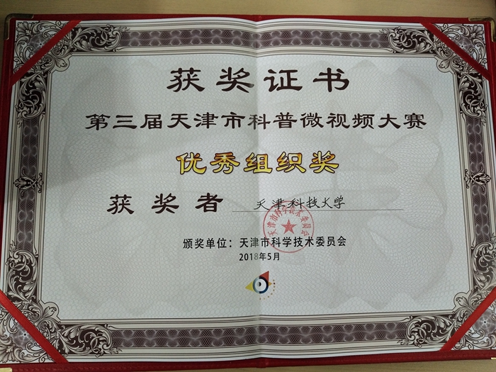 日前,从第三届天津科普微视频大赛传来喜讯,天津科技大学获优秀组织单位奖,这是学校自大赛成立至今连续三年获评优秀组织奖。我校学生刘源、李星慧、王佳乐、李建的作品《垃圾食品和超级食物》在众多参赛作品中脱颖而出,荣获一等奖及最佳人气奖。我校同学唐光谱、张苹苹、杨莉杰、高轶楠、王轩羽的作品《蛀牙、智齿的产生》获二等奖;张楠、安楠、李可越的作品《牛奶加橙汁的秘密》获三等奖;何国梁、王润、张天杨、候鸿旭、郭慧鑫的作品《科普小视频之心肺复苏》获三等奖。