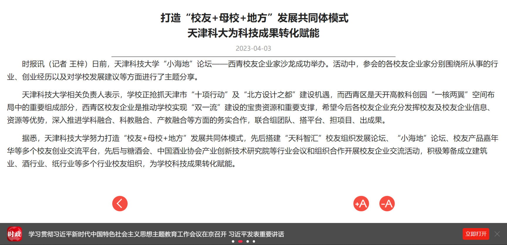 天津科技大学努力打造“校友+母校+地方”发展共同体模式,先后搭建“天科智汇”校友组织发展论坛、“小海地”论坛、校友产品嘉年华等多个校友创业交流平台,先后与糖酒会、中国酒业协会产业创新技术研究院等行业会议和组织合作开展校友企业交流活动,积极筹备成立建筑业、酒行业、纸行业等多个行业校友组织,为学校科技成果转化赋能。