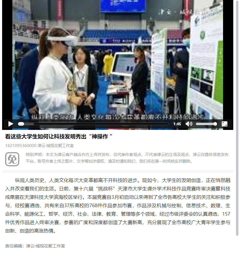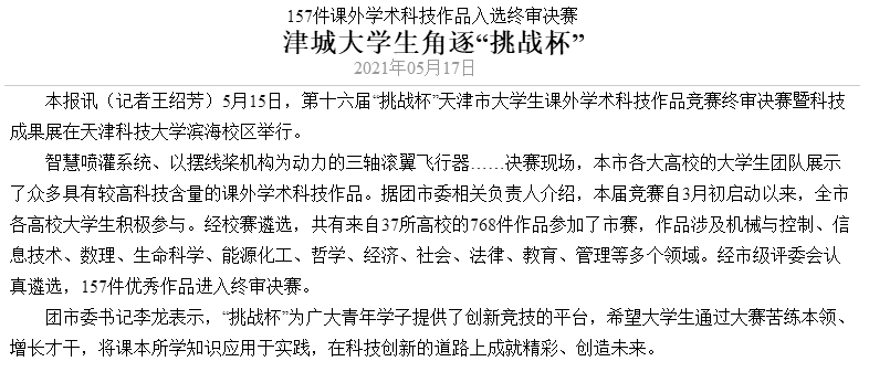 近日,第十六届“挑战杯”天津市大学生课外学术科技作品竞赛终审决赛暨科技成果展在天津科技大学滨海校区举行。