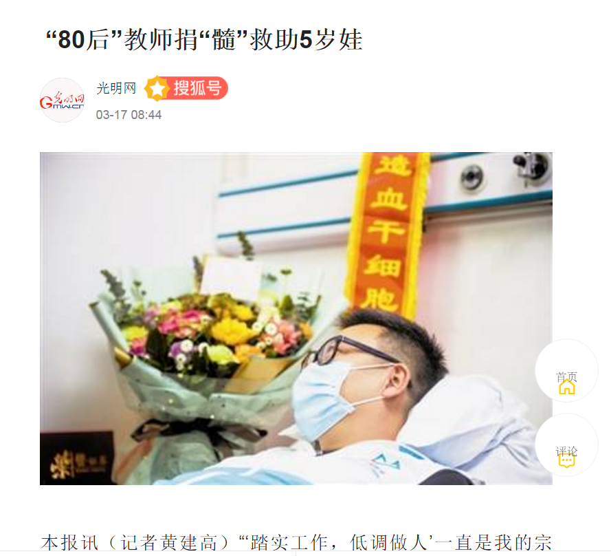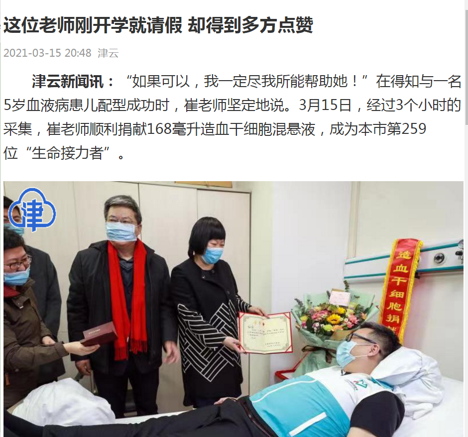 3月15日,在天津市第一中心医院血液科采集室,我校志愿者崔老师成功为一名五岁血液病患儿捐献造血干细胞的爱心事迹,他也成为了本市第259位“生命接力者”。《光明网》《网易新闻》《天津教育报》等媒体进行相关报道。现将部分原文转载如下: