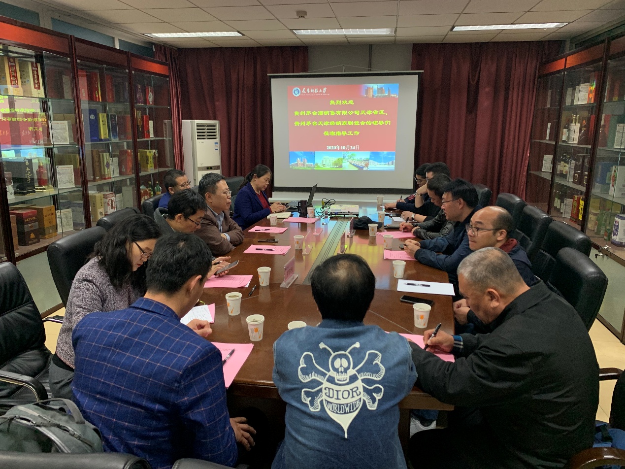 10月24日,贵州茅台集团天津省区经理胡秋翌和天津华溢睿智酒类销售有限公司经理肖宏一行9人来我校交流洽谈,党委副书记、校长路福平、财务处处长、校友办主任文峰、生物工程学院院长罗学刚、副院长滕玉鸥及部分老师出席交流座谈会,会议由罗学刚主持。