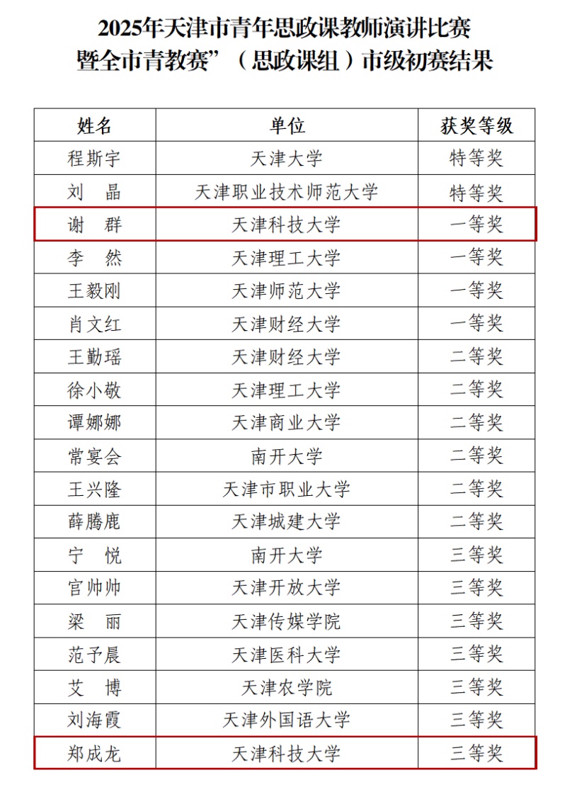 近日,2025年天津市青年思政课教师演讲比赛暨全市“青教赛”(思政课组)市级初赛在天津职业技术师范大学落幕。我校马克思主义学院教师谢群、郑成龙分别斩获大赛一等奖和三等奖。