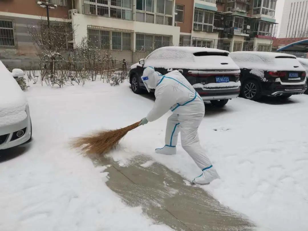 “小伙子,你们辛苦啦!”轻工学院副院长刘泽华是15号楼楼栋的组长,扫雪的过程中,不断有居民向他送来温暖和鼓励的话。穿着防护服,居民无法准确辨认刘泽华的长幼,刘泽华也已不是居民们口中的“小伙子”,但是他对待工作的那份劲头却一点不输小伙子。“我们共产党员就要讲大局、讲奉献,学校的工作需要我,我就全力以赴投入学校工作,疫情防控前线需要我,我就服从组织调遣,义不容辞。津南区疫情已经得到有效控制了,只要我们再一起坚持一段时间,春暖花开很快就能到来!”清扫完马路,刘泽华在落了雪的车上写下“加油!”二字,又立刻与其他队员一起投入核酸检测的工作。