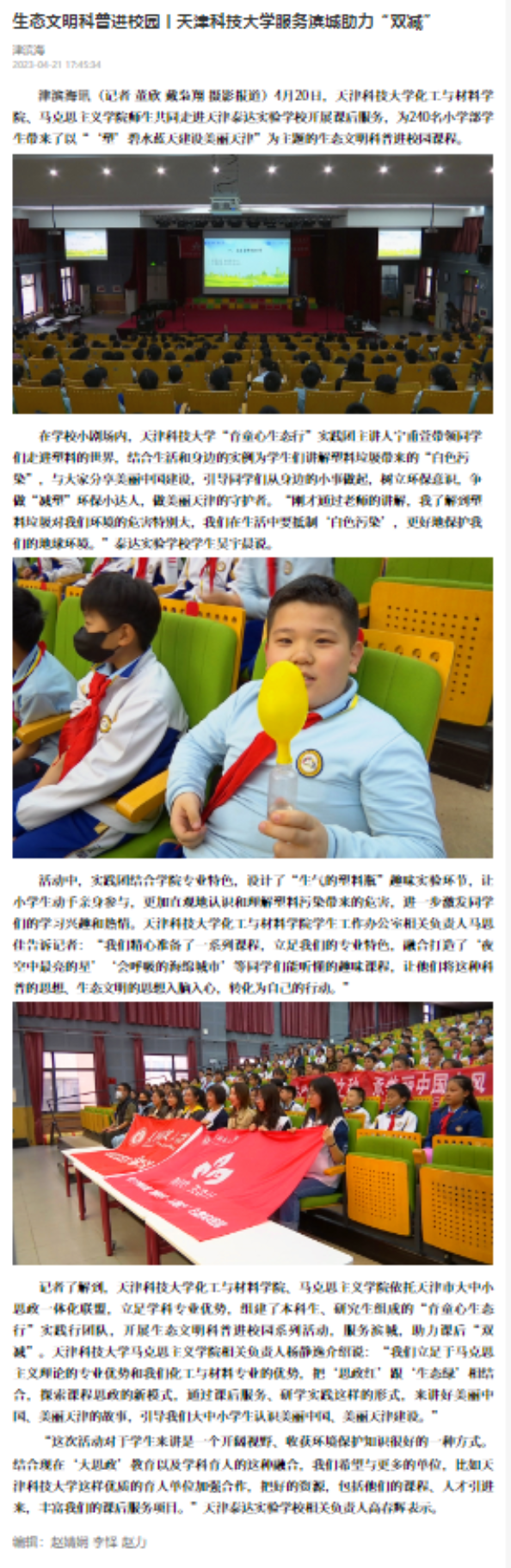 4月21日,津滨海报道天津科技大学服务滨城助力“双减”助力生态文明科普进校园。4月20日,天津科技大学化工与材料学院、马克思主义学院师生共同走进天津泰达实验学校开展课后服务,为240名小学部学生带来了以“‘塑’碧水蓝天建设美丽天津”为主题的生态文明科普进校园课程。