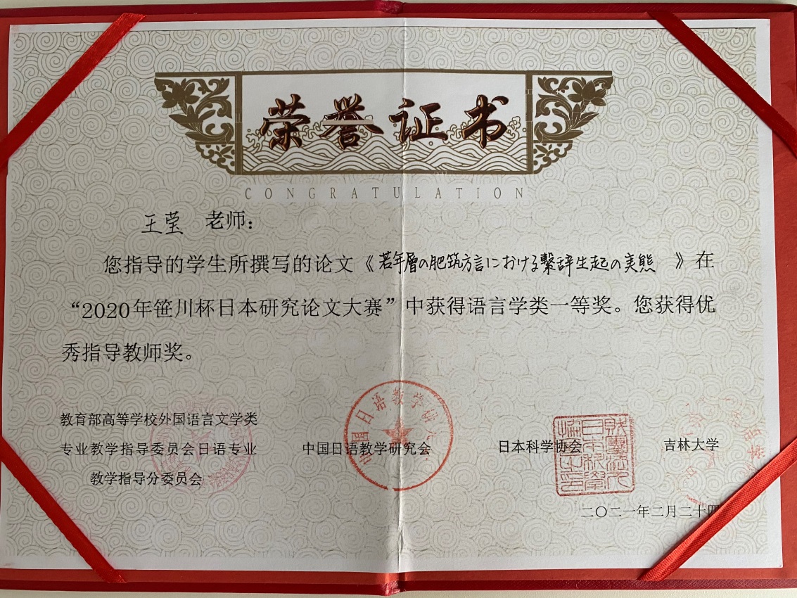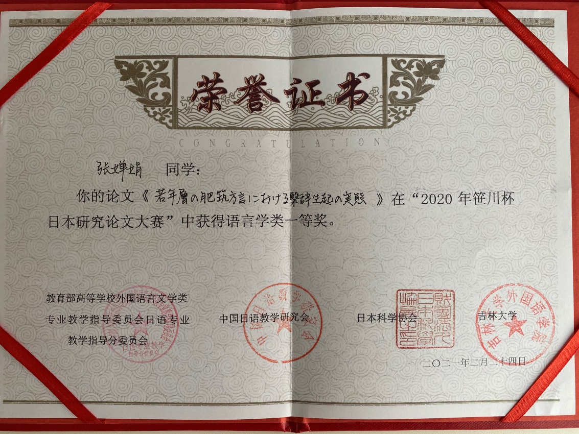 近日,“2020年笹川杯日本研究论文大赛”颁奖典礼于线上举行。我校外国语学院2017级日语专业本科生张婵娟同学的论文《若年層の肥筑方言における繋辞生起の実態》荣获语言组一等奖,王莹老师荣获优秀指导教师奖。