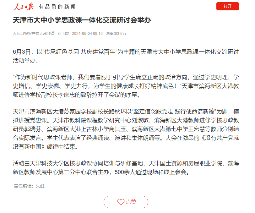活动由天津科技大学区校思政课协同培训与研修基地、天津国土资源和房屋职业学院、滨海新区教师发展中心第二分中心联合主办,500余人通过现场和线上参会。