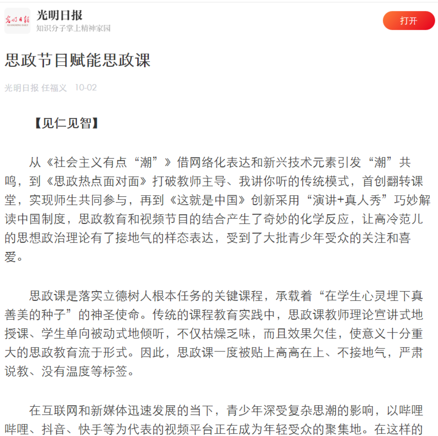 10月9日,《光明日报》刊发我校教师理论文章《思政节目赋能思政课》。文章指出,从《社会主义有点“潮”》借网络化表达和新兴技术元素引发“潮”共鸣,到《思政热点面对面》打破教师主导、我讲你听的传统模式,首创翻转课堂,实现师生共同参与,再到《这就是中国》创新采用“演讲+真人秀”巧妙解读中国制度,思政教育和视频节目的结合产生了奇妙的化学反应,让高冷范儿的思想政治理论有了接地气的样态表达,受到了大批青少年受众的关注和喜爱。现将原文转载如下:
