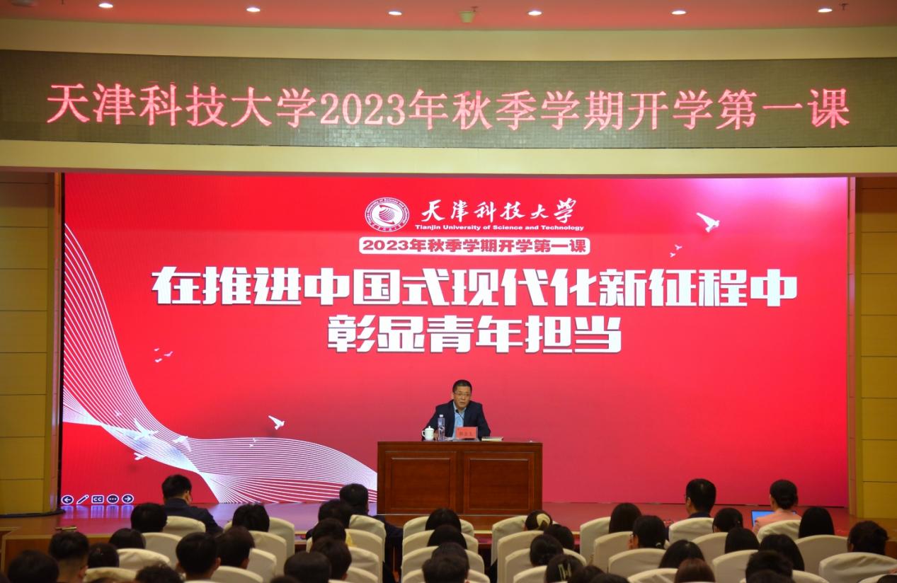 为深入学习贯彻党的二十大精神,推动党的理论成果走进校园、走进课堂、走进学生,引导学生坚定理想信念,争做时代新人,10月10日上午,天津科技大学面向师生在滨海校区逸夫楼报告厅开展形势政策开学第一课教育活动。校党委书记韩金玉以“在推进中国式现代化新征程中彰显青年担当”为主题,为学校师生上了生动的一课。各学院学生工作干部、2023级学生代表200余人参会。