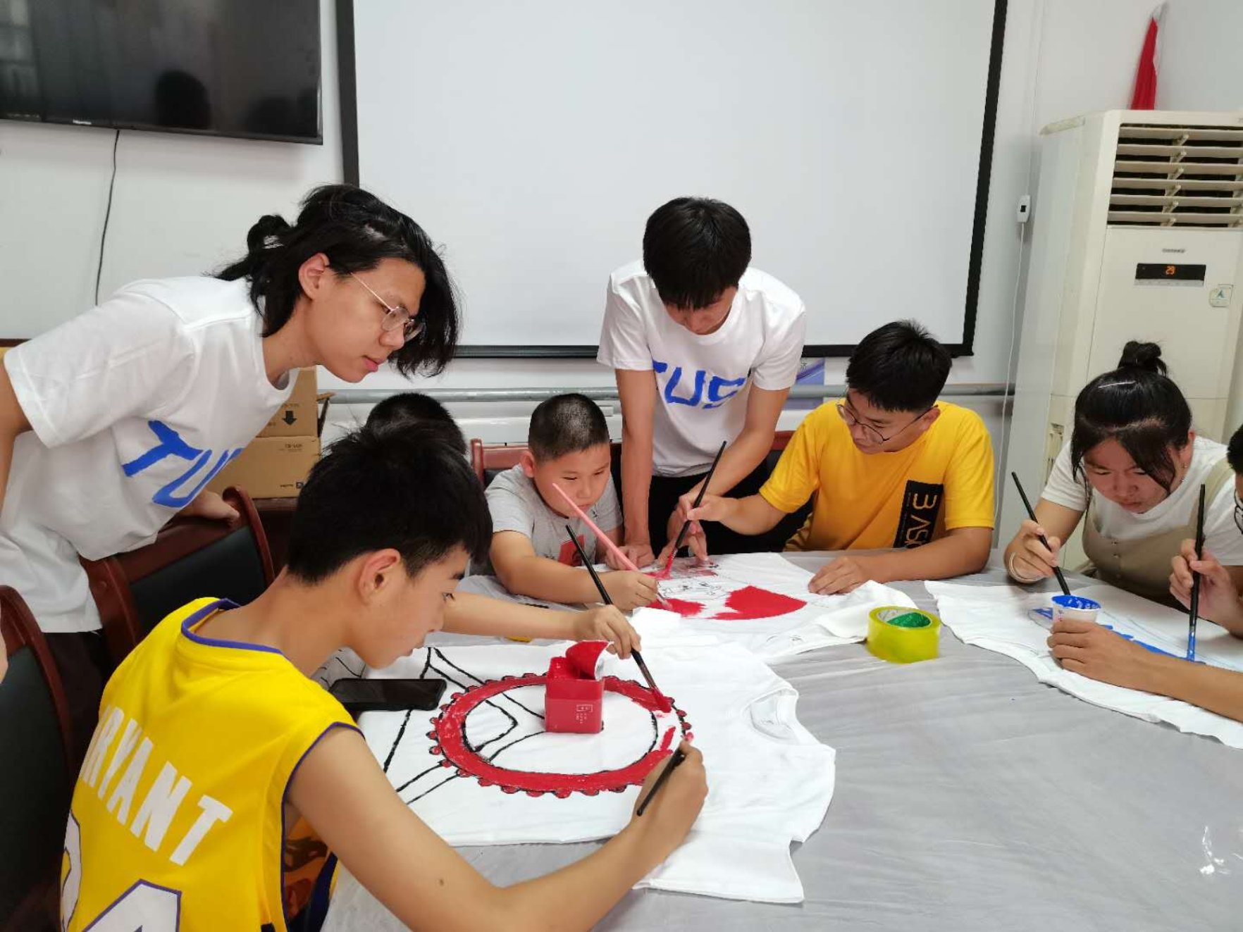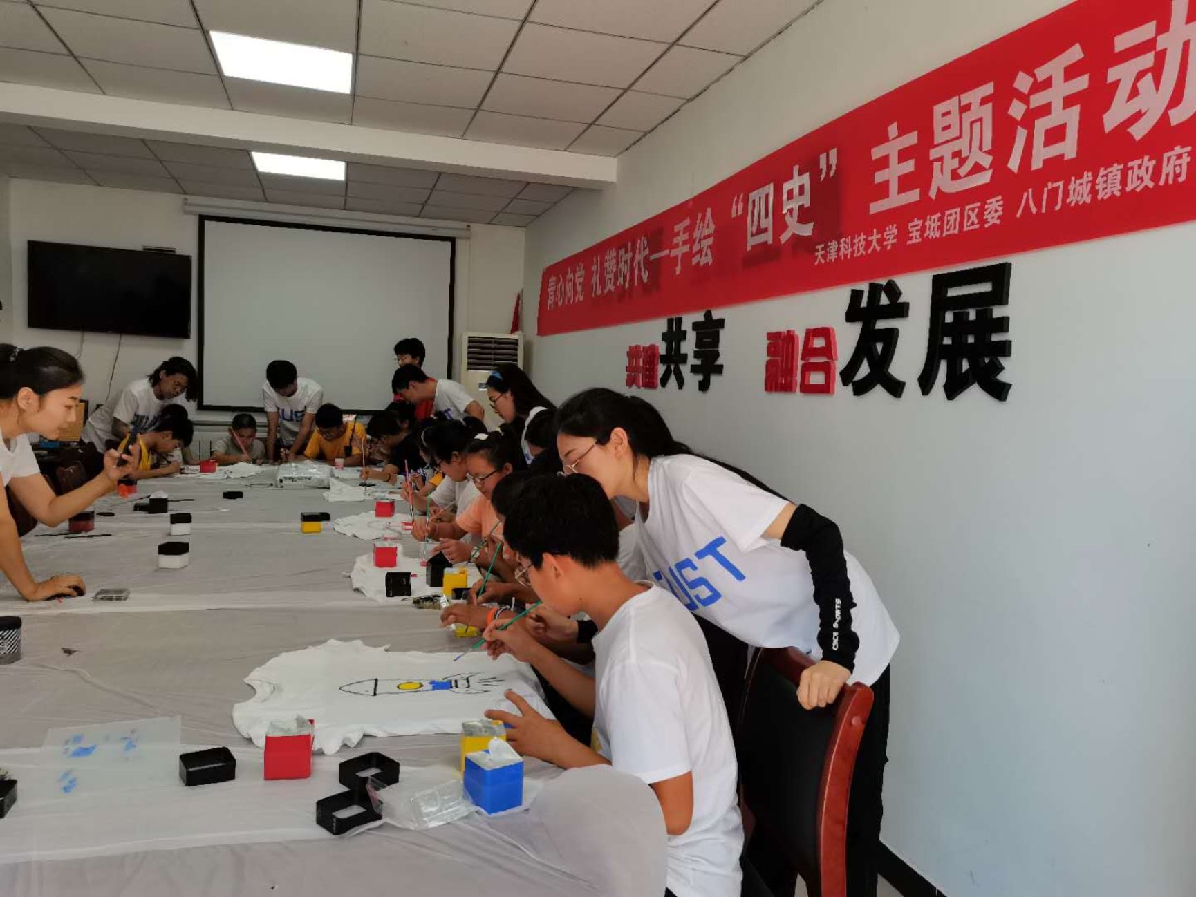 图为实践团成员和中小学生一起创作“四史”文化衫