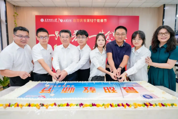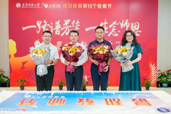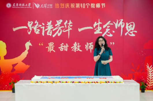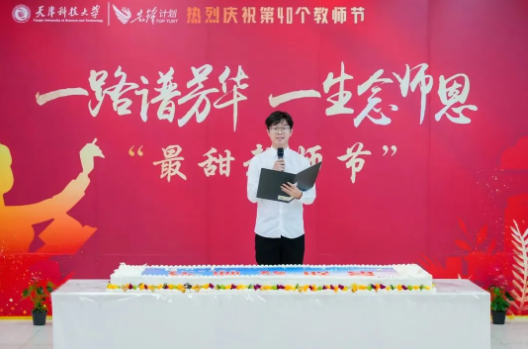 为庆祝第40个教师节,9月10日,天津科技大学在学校餐厅组织开展“最甜教师节”主题活动。校党委书记白海力、副校长曲志刚出席。宣传部、学工部、后勤管理处负责同志、教师代表、学生代表50余人参加。