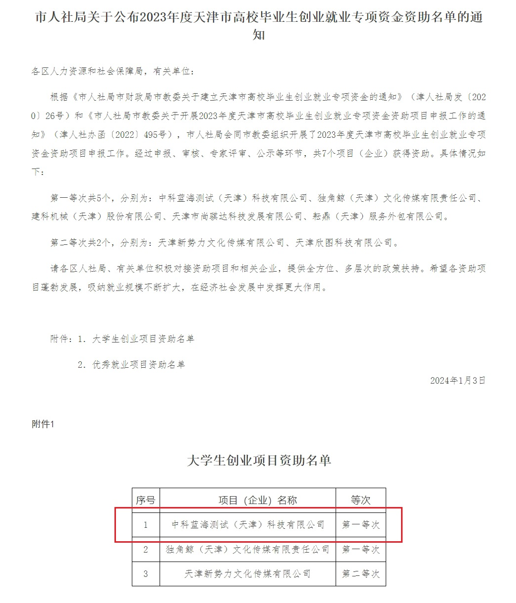日前,为进一步推动创业工作开展,浓厚创业氛围,市人社局、市教委开展了2023年度天津市高校毕业生创业就业专项资金资助项目申报工作。经学生申报、学院学校审核推荐、市教委审核、专家评审等环节,2023年度天津市高校毕业生创业就业专项资金资助名单揭晓,我校生物工程学院2020级博士研究生张守庆申报的项目“中科蓝海测试(天津)科技有限公司”获批2023年度天津市高校毕业生创业就业专项资金资助大学生创业项目资助第一等次(天津市仅2项)。