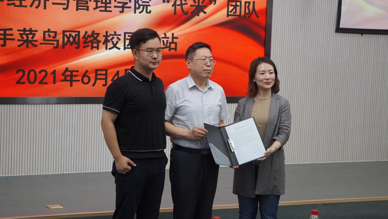 2021年6月4日下午,我校“互联网+”参赛团队“代米”团队与菜鸟网络校园驿站签约仪式于滨海中校区第一报告厅隆重举行,我校党委副书记、校长路福平,教务处、校团委、经管学院相关负责同志,菜鸟网络校园驿站负责人,“代米”团队指导老师李雪出席签约仪式。