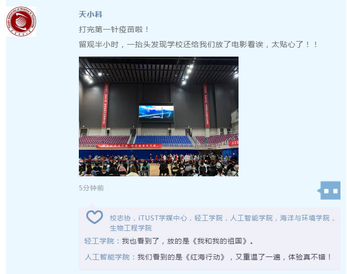 “我接种过程中基本没什么不适应,现场秩序也比较好,整体感觉就是安全又放心。真的非常感激国家能够给每一个公民提供这个机会,对于我们这个人口大国来说确实是个很不容易且很伟大的事情,我们大学生更应该珍惜国家的这份人文关怀、积极地参与当中,为我国的防疫事业尽到自己的一份力。”