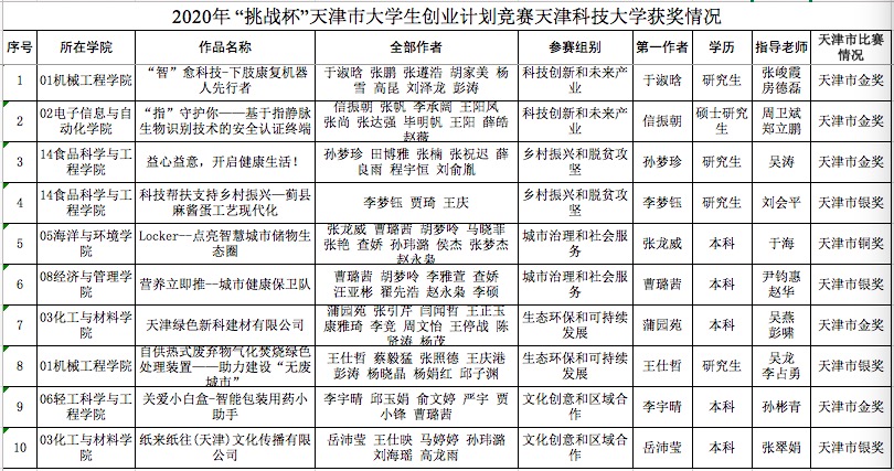 附:2020年“挑战杯”天津市大学生创业计划竞赛天津科技大学获奖情况