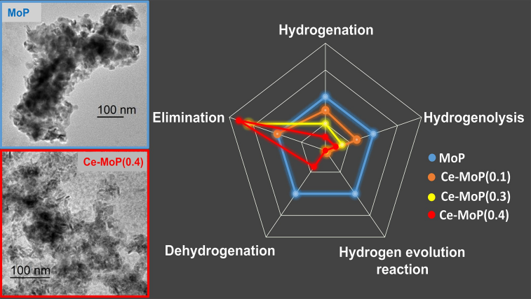 氢气是21世纪最具发展潜力的清洁能源载体,而利用风能和水能等清洁可再生能源以及“三弃(弃水、弃风和弃光)”电能通过电解水制取洁净“绿氢”,是制氢技术的发展方向。人们很早就认识到HDS和电催化分解水制氢(HER)之间可能存在内在联系,因为MoS2、Mo2C、NiMo硫化物及过渡金属磷化物等最受关注的非贵金属HER催化剂同时也是主要的HDS催化剂。揭示这一内在联系,对于能源催化有重要的理论意义。李翔教授团队联合天津大学张生教授团队以及瑞士联邦理工RoelPrins教授,通过添加铈氧化物助剂,制备了一系列具有不同形貌、不同配位状态和酸碱性质的MoP催化剂,选用多种模型化合物,系统研究了这些催化剂的HDS和加氢脱氮性能,同时考察了它们酸性条件下的HER活性,发现HER和加氢精制过程中涉氢反应(如加氢、脱氢和氢解等反应)有内在联系,但是与β消除等不涉氢反应无关。这种内在联系很可能与氢气吸附及催化剂配位状态有关。这些成果近期发表在催化领域重要期刊ACSCatalysis(2023, 13(20), 13786-13803)上。
