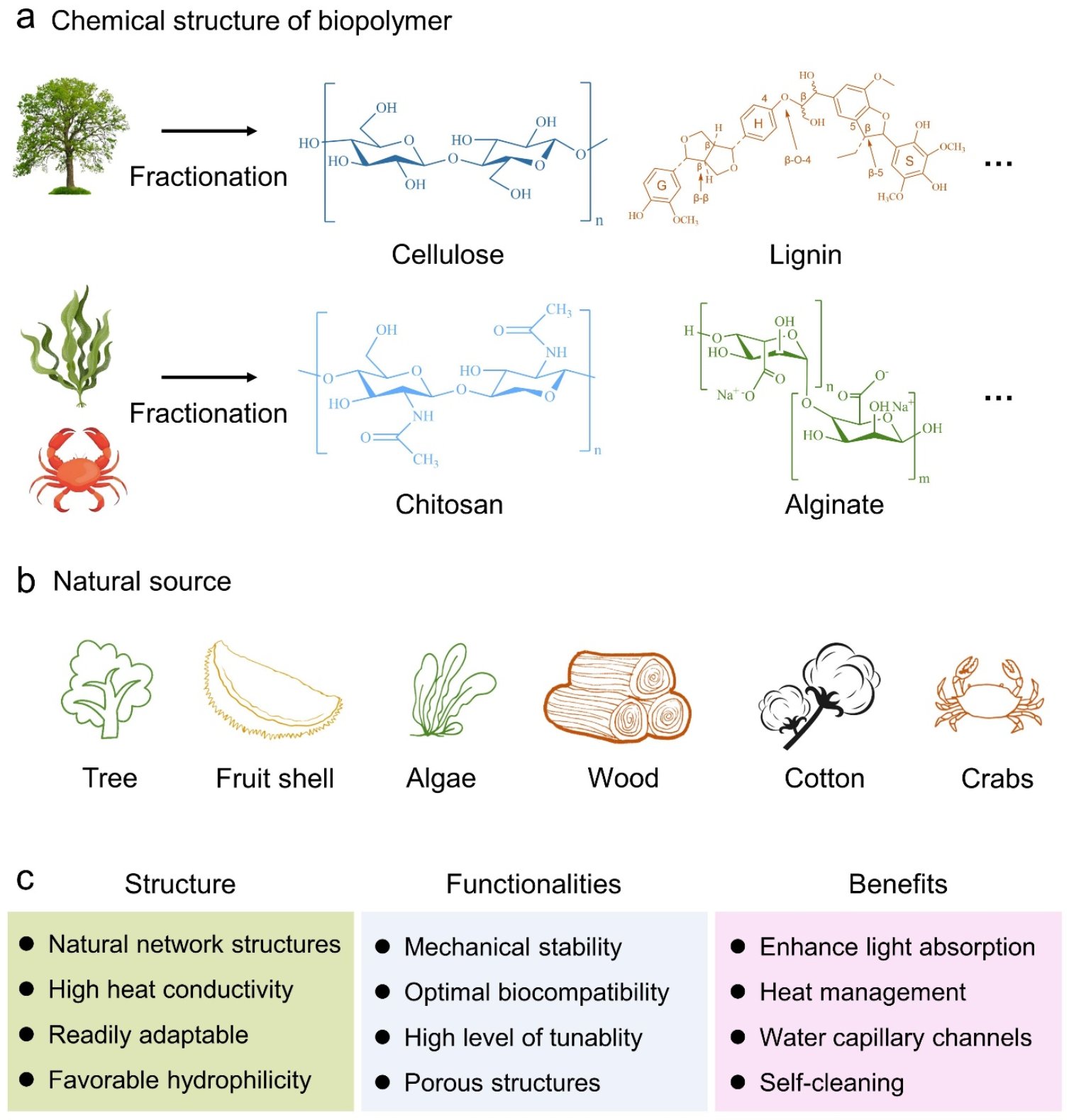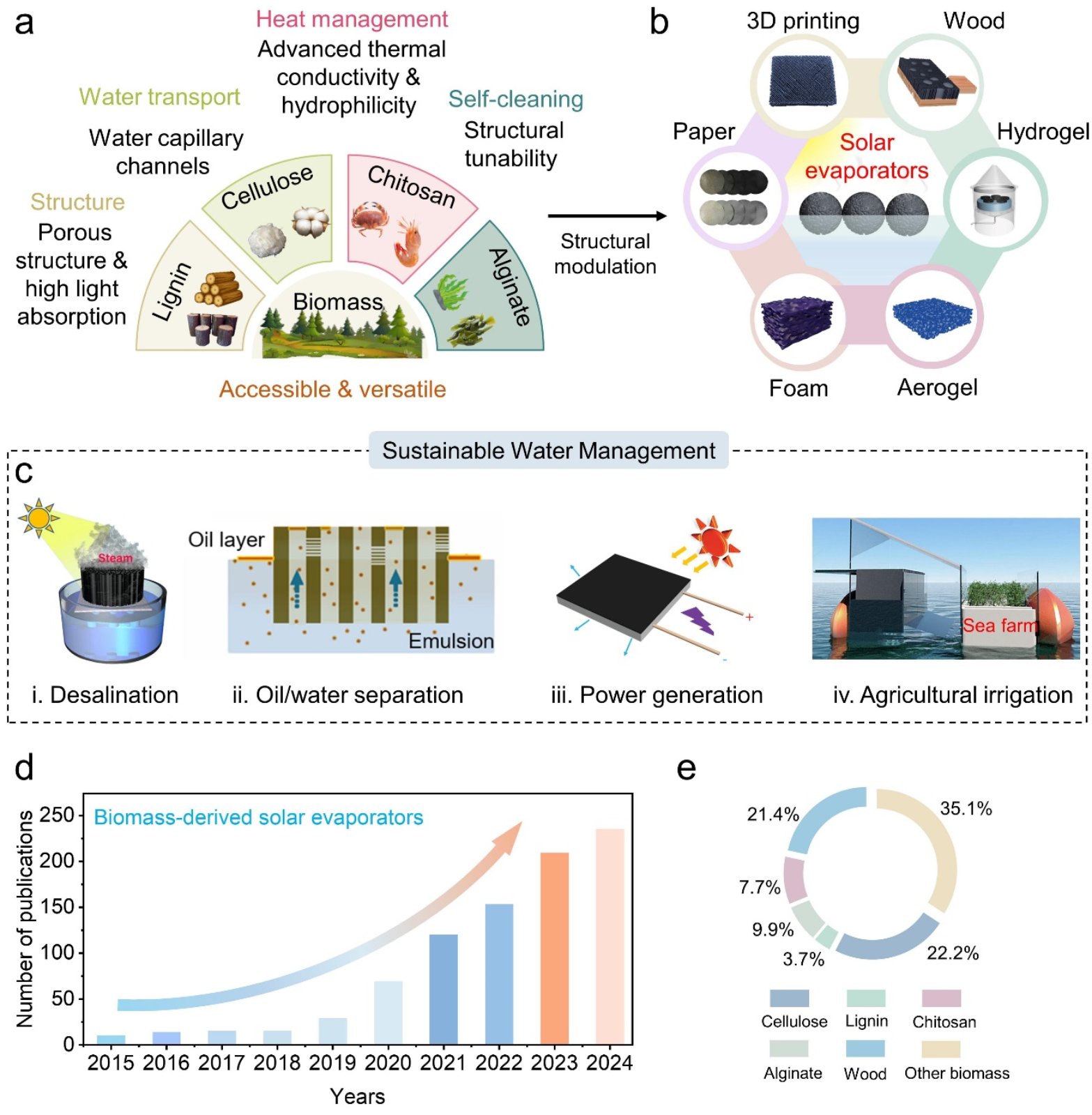 在太阳能蒸发器的生物质材料研究领域,核心方向主要聚焦于纤维素、木质素、壳聚糖及海藻酸钠四大天然聚合物。这类天然聚合物具备双重关键价值:一方面能显著提升太阳能蒸发器的能量转换效率,夯实设备核心性能基础;另一方面可依托自身天然可再生特性,进一步强化设备的环境可持续性——二者协同作用,成为优化蒸发器综合性能的核心支撑。从资源属性来看,上述天然聚合物的原料多取自秸秆、稻壳、玉米芯、坚果壳、果皮等农林废弃物。对这类低成本原料的高效开发利用,不仅大幅降低了生物质基太阳能蒸发器的材料制备成本,更开辟了农业废弃物资源化利用的新方向,实现了“降本”与“环保”的双重效益。值得注意的是,这类天然聚合物的应用价值并非局限于太阳能蒸发器领域。凭借优异的物化特性,其在生物材料、功能材料及超级电容器材料等多个前沿研究与产业领域,同样有着广泛且重要的应用,展现出极强的跨界适配潜力。