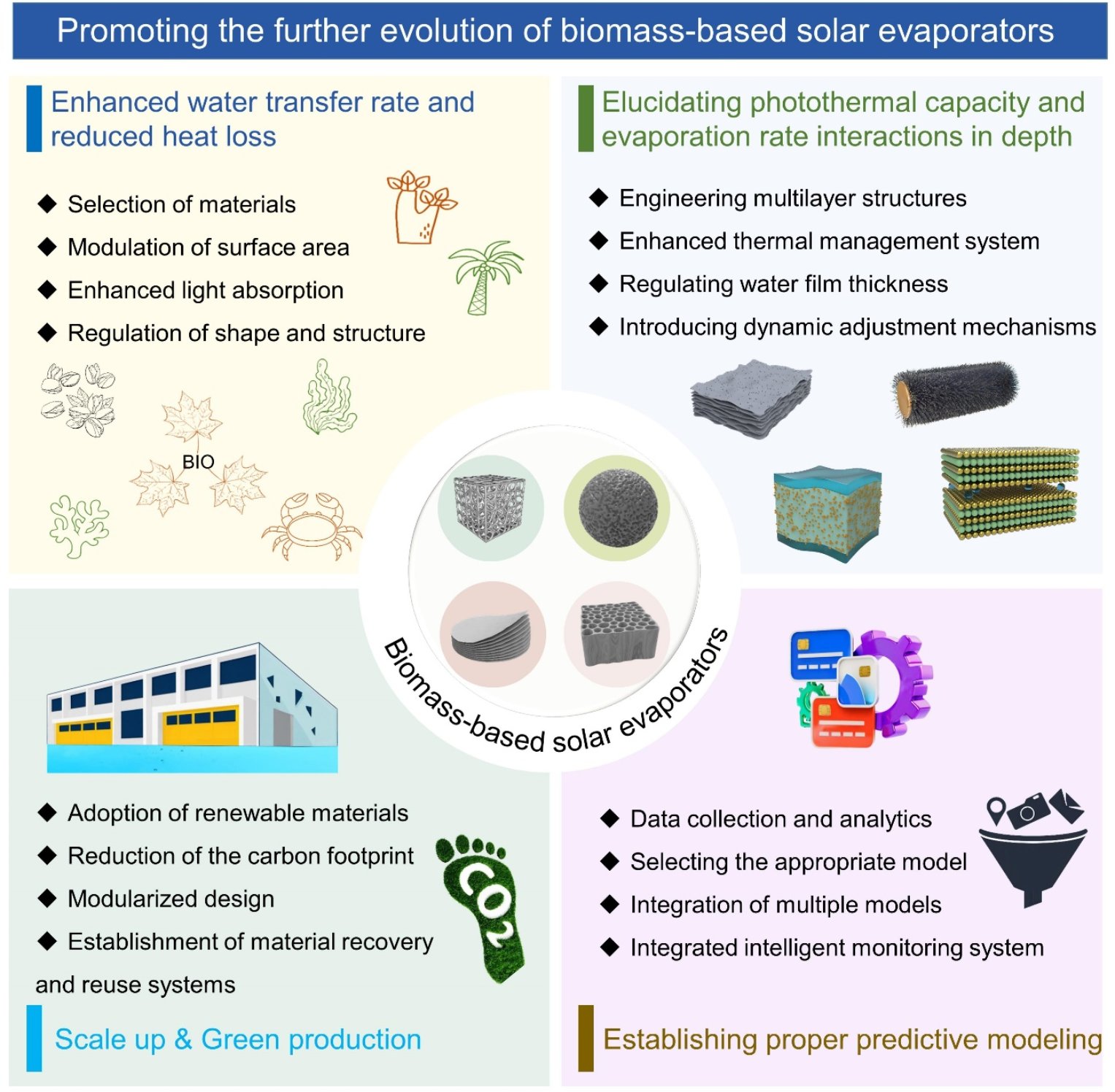 生物质基太阳能蒸发器依托天然多孔结构、优异的光热转换效率、出色的亲水性及良好的环境友好性,已成为推动海水淡化、蒸汽发电及农业灌溉等领域绿色发展的“潜力技术”。然而,该类材料在实际应用中仍面临着核心瓶颈——一方面宽带光吸收能力受限,难以充分利用太阳能;另一方面易因盐沉积导致孔隙堵塞,影响长期稳定运行。因此,对生物质材料的物理化学结构开展多维度精准调控,已成为突破上述瓶颈、提升生物质基太阳能蒸发器综合性能的关键突破口。这一研究方向不仅为优化蒸发器性能提供了核心思路,更有望为构建高效、稳定且多场景适配的新一代水处理系统,提供兼具创新性与实用性的关键解决方案。