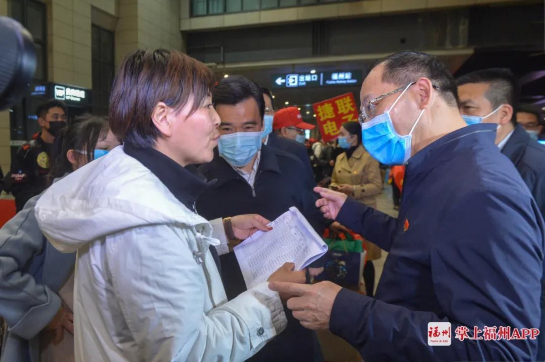 2021年2月21日,福州派出的首趟返岗专列迎来529名定西籍员工,王命瑞(右一)到福州站迎接务工人员回榕返岗。
