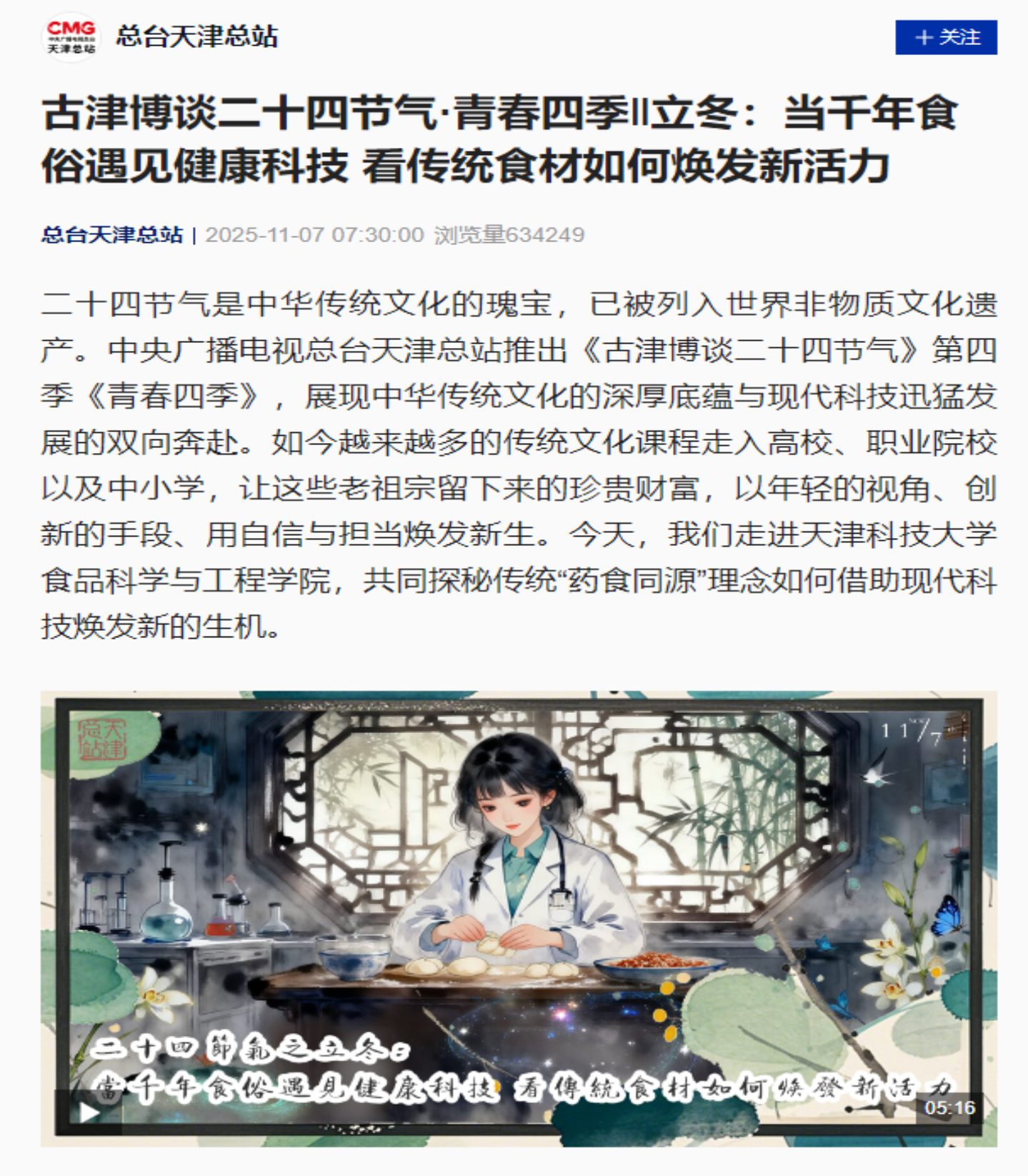 11月7日,专题节目一同走进天津科技大学食品科学与工程学院,共同探秘传统“药食同源”理念如何借助现代科技焕发新的生机。