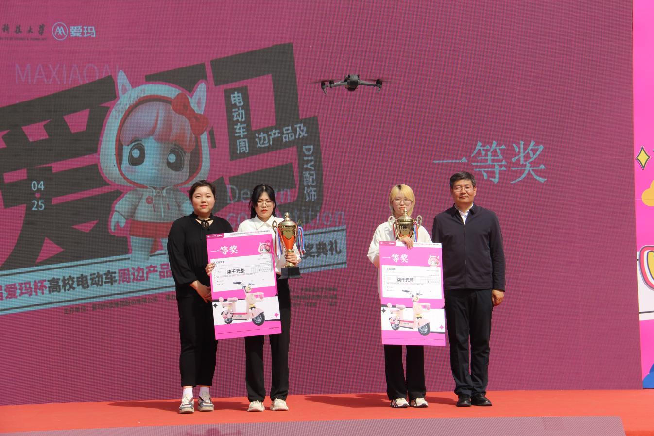 校党委副书记贾启君和爱玛首席人才官李娜分别为荣获A、B赛道一等奖的两位同学张琳、张文晴颁奖