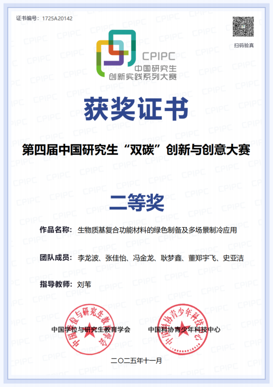 近日,第四届中国研究生“双碳”创新与创意大赛决赛在沈阳举行。由我校轻工科学与工程学院刘苇教授指导的项目“生物质基复合功能材料的绿色制备及多场景制冷应用”,斩获全国二等奖。