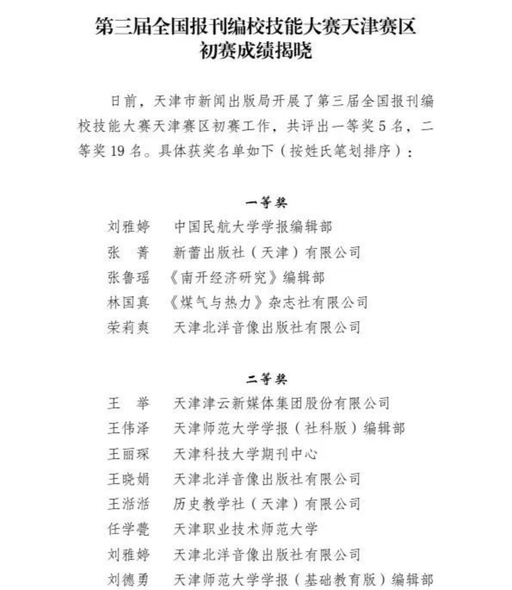 日前,第三届全国报刊编校技能大赛天津赛区初赛成绩揭晓。天津市共24名同志获奖,我校期刊中心王丽琛、郎婧、周建军代表学校参赛,全部获奖,荣获“第三届全国报刊编校技能大赛”(天津赛区)二等奖。
