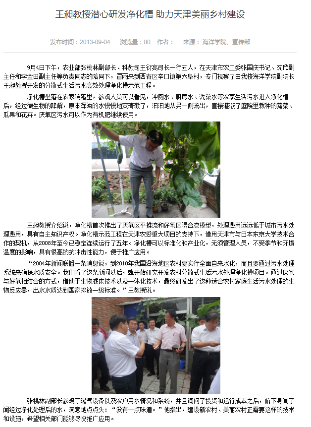 王昶教授潜心研发净化槽 助力天津美丽乡村建设