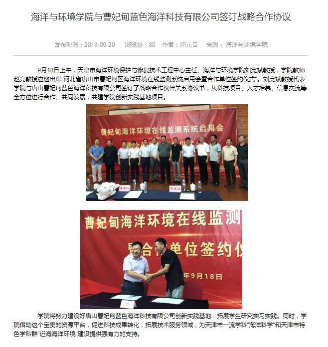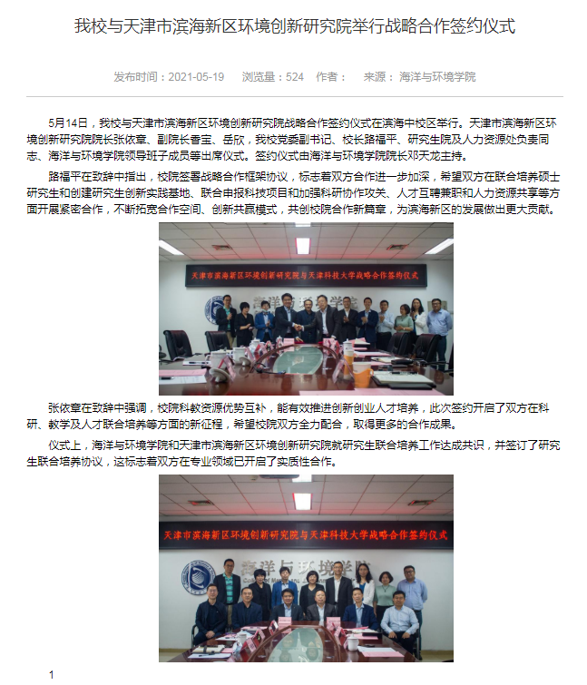 近十年,学院与多家企事业单位签订合作框架协议,如:2018年与河北唐山曹妃甸蓝色海洋科技有限公司签署建立战略合作伙伴关系协议以及研究生创新实践基地建设框架协议,同时与国投生物科技投资有限公司签订战略合作框架协议。2020年与国家海洋博物馆签署战略合作框架协议,在产学研用协同创新上实现资源共享、优势互补,为我国海洋事业发展培养又红又专的建设者和接班人。同时与福建省中核工勘察设计有限公司签署产学研合作协议,共建就业实习基地。2021年与天津市滨海新区环境创新研究院签订战略合作协议,共创校院合作新篇章。同时双方就研究生联合培养工作达成共识,并签订了研究生联合培养协议。2012年天津科技大学作为合作单位首次参加国家基金委第二次东印度洋科学考察项目。