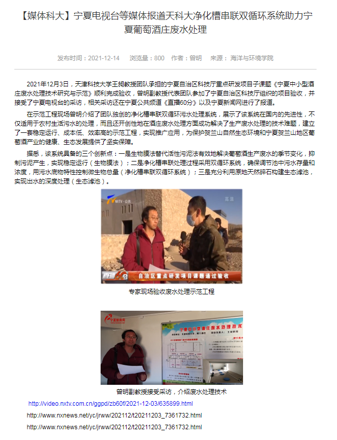 宁夏电视台等媒体报道天科大净化槽串联双循环系统助力宁夏葡萄酒庄废水处理