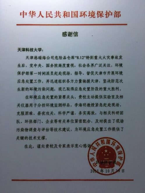 环境保护部在2015年天津港“8.12”事故应急处置中对李海明教授的感谢信