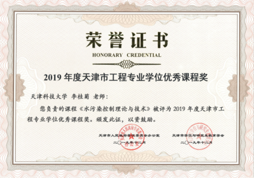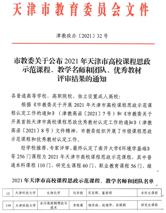 学院不断加强研究生教学质量建设,《水污染控制理论与技术》课程获批天津市高校课程思政示范课程。学院获批研究生教育改革校级项目4项,研究生校级教学成果一等奖1项。