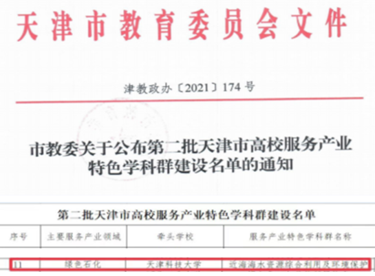 学科、专业建设取得新进展。学院两个一级学科,建设成效显著。“十三五”期间,海洋科学学科、环境科学与工程学学科均被列为天津市重点学科。2011年,获批海洋科学一级学科硕士点和环境科学与工程一级学科硕士点。2012年,环境科学和物理海洋学2个二级学科获硕士学位授权点。2017年,海洋科学一级学科入选天津市双一流学科,环境科学与工程一级学科牵头的“近海海洋环境”入选天津市特色学科群;2021年,“海洋科学”“环境科学与工程”两个学科群入选天津市高校服务产业特色学科群“近海海水资源综合利用及环境保护”。2020年,完成海洋科学一级学科博士点申报。