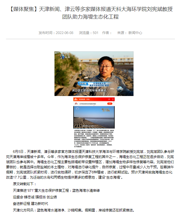 天津新闻、津云等多家媒体报道刘宪斌教授团队助力海堤生态化工程