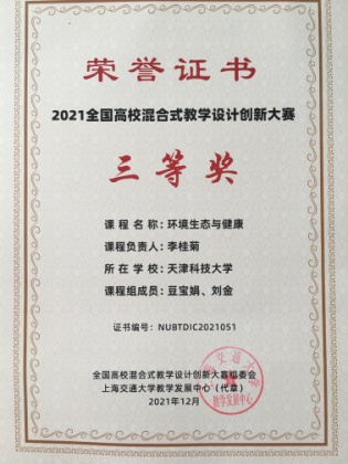 近十年,学院获省部级以上教学成果奖3项,教学竞赛获奖6项;天津市教学名师1名,天津市高校课程思政教学名师2名,天津市高校课程思政教学团队2支;《环境生态与健康》《生物化学》《环境化学》获批3门市级一流课程,《环境生态与健康》获批天津市高校新时代“课程思政“改革精品课,《水污染控制理论与技术》获批天津市工程专业学位优秀课程奖。教师积极进行教学创新,荣获第七届西浦大学教学创新大赛一等奖,全国高校混合式教学设计大赛三等奖,全国教学设计创新大赛天津赛区二等奖2项,省部级教学基本功竞赛奖4项,起到了示范和推广作用。学生在“互联网+”“挑战杯”“大学生节能减排社会实践与科技竞赛”“化学竞赛”“数学建模大赛”等比赛中获得省部级级以上奖项270余项,承担大学生创新创业训练项目170项,其中省部级32项,国家级37项。