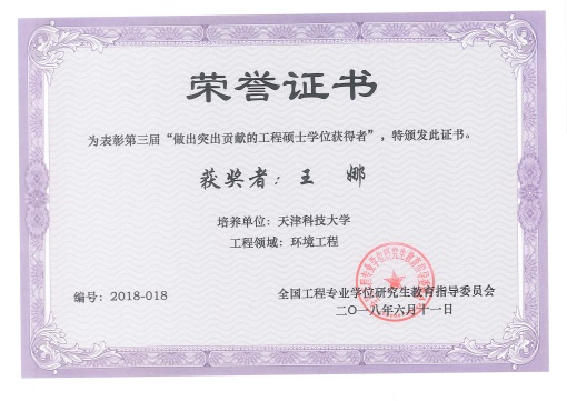 研究生实践创新能力不断提升,在各类学术竞赛中不断获奖,例如研究生田琪在第七届“互联网+”大学生创新创业大赛天津赛区高教主赛道中获铜奖(2021年),研究生庞润懿在第十六届“挑战杯”中国银行天津大学生课外学术科技作品竞赛中获一等奖(2021年)。环境工程领域工程硕士研究生王娜和林玉科分别获得由全国工程专业学位研究生教育指导委员会主办的第三届“做出突出贡献的工程硕士学位获得者”和第五届“工程硕士实习实践优秀成果获得者”荣誉称号(2018年)。