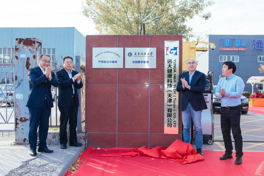 签约仪式结束后,路福平、曲海富、魏恩雨、魏立佳共同为天津科技大学—远大健康科技(天津)有限公司产学研合作基地、天津科技大学实践教学基地揭牌。校企双方将依托两个基地,在人才培养、技术创新、产品研发、成果转化等方面深入开展合作。