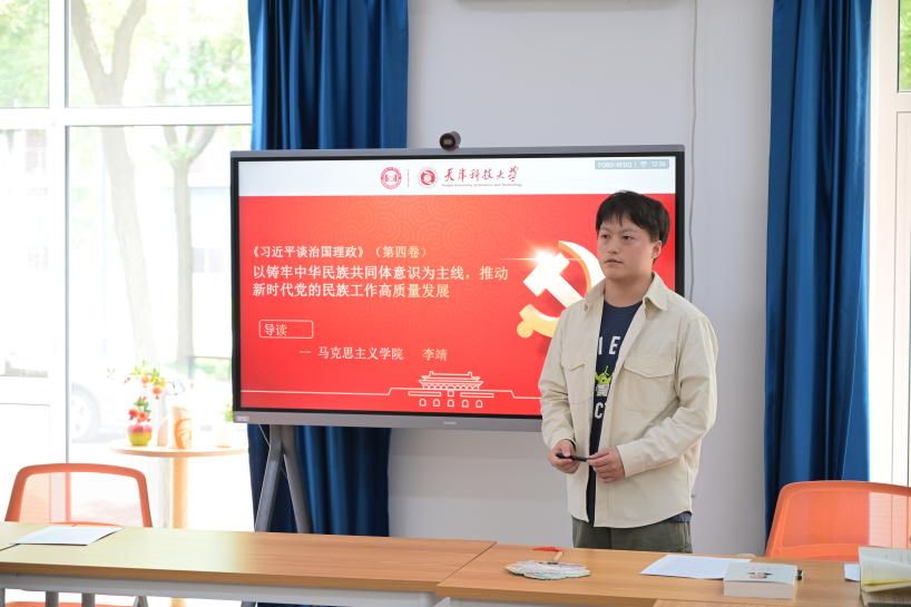 读书小组成员李靖从战略高度、思想深度、理论维度出发,带领在场同学共同学习《习近平谈治国理政》第四卷中《以铸牢中华民族共同体意识为主线,推动新时代党的民族工作高质量发展》一篇内容,他呼吁同学们要以更加坚定的历史自信、文化自信,铸牢中华民族共同体意识,推进新时代党的民族工作高质量发展。