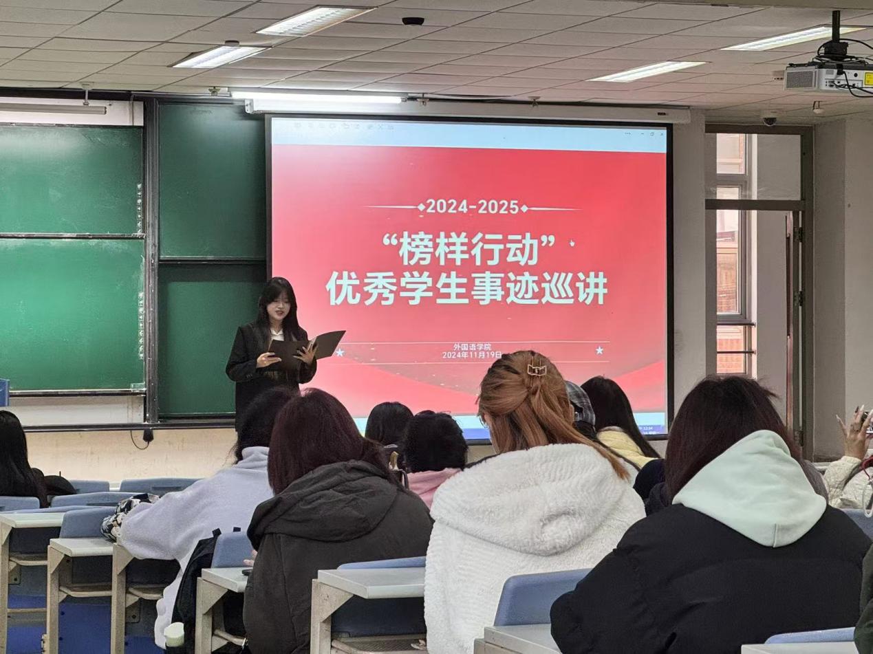 为深入学习贯彻习近平新时代中国特色社会主义思想和党的二十大精神,全面落实“先锋计划”,深化“思政铸魂”行动,充分发挥先进典型示范引领作用,持续讲好榜样故事,把榜样力量转化为生动实践,外国语学院于2024年11月19日第二阶梯教室举办了“先锋领航 筑梦未来”外国语学院“榜样行动”优秀学生事迹系列巡讲第一场。2023级英语专业及日语专业的41班、42班参加此次活动,宣讲会由杜奕霏、张涵、郝嘉怡、刘杨柳青四名巡讲团成员主讲。