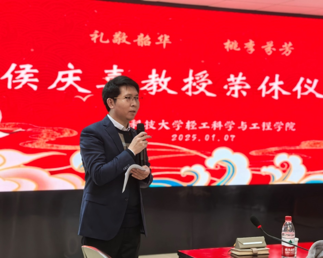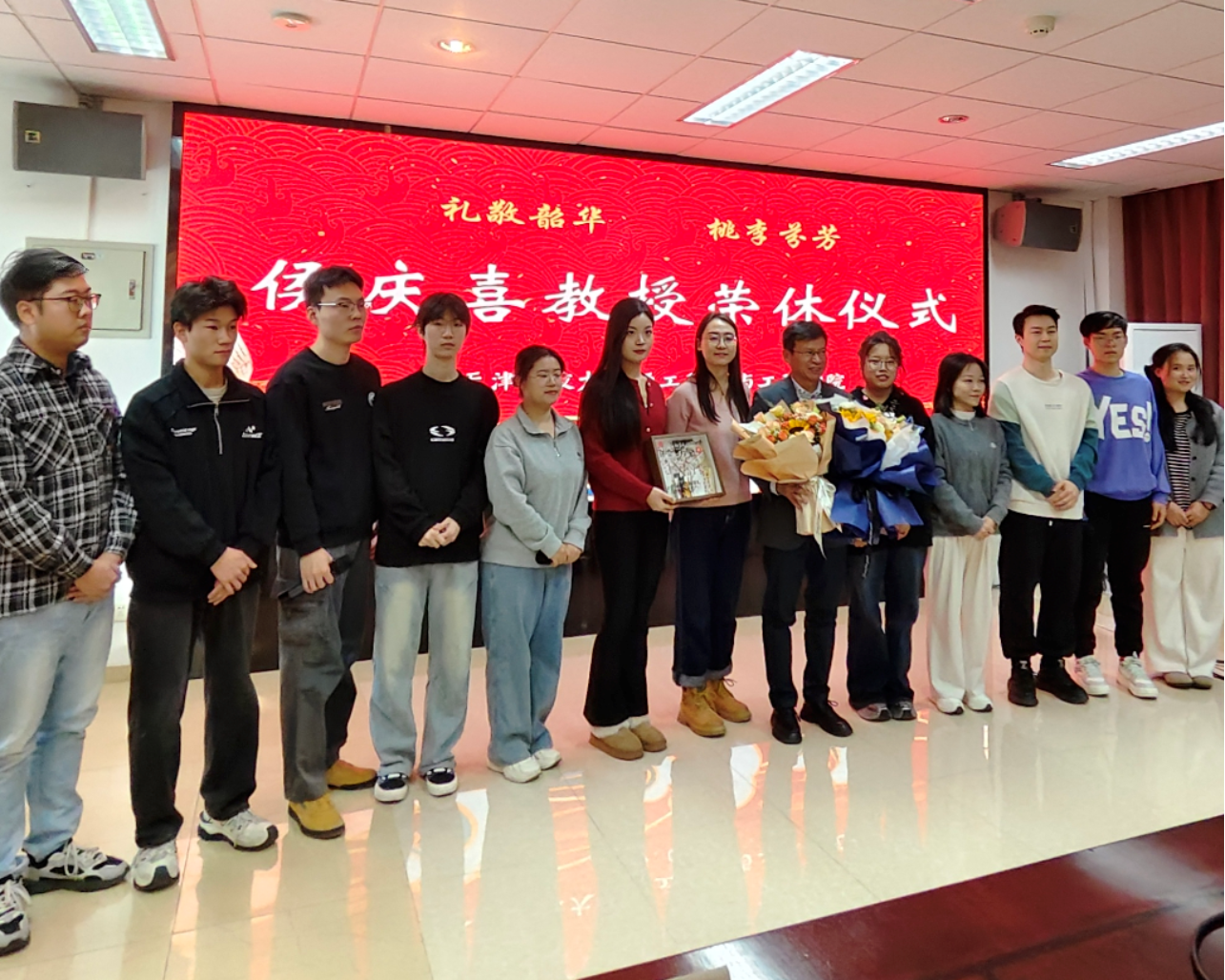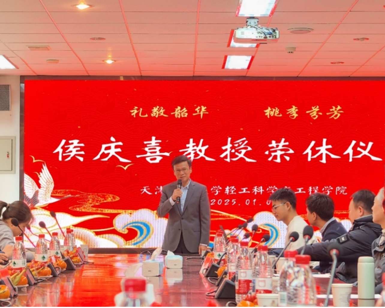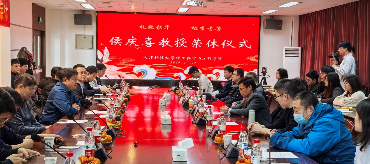 为深入学习贯彻习近平总书记关于教育的重要论述和视察天津重要讲话精神,贯彻落实《中共中央国务院关于弘扬教育家精神加强新时代高素质专业化教师队伍建设的意见》,全面推进实施天津科技大学“先锋计划”,轻工科学与工程学院为天津市特聘教授、天津市劳动模范、天津市教育工委劳模创新工作室负责人侯庆喜教授举办了荣休仪式。仪式由轻工科学与工程学院工会主办,工会主席刘苇教授主持,学院领导班子全体成员、教师代表,以及研究生代表等80余人参加了此次活动。在这冬日暖阳中,大家齐聚一堂,共同为侯庆喜教授的荣休送上诚挚的祝福。