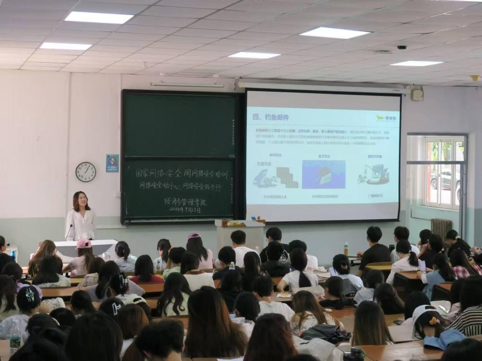 9月9日至15日是国家网络安全宣传周。在数字化转型浪潮席卷全球的今天,网络安全已成为维护国家安全、社会稳定和人民群众利益的重要基石。为进一步宣传贯彻落实习近平总书记关于网络强国的重要思想,提升学生网络素养、网络安全意识和防护技能,营造共筑网络安全防线的浓厚氛围,2024年9月13日,经济与管理学院在河西校区7阶举行网络安全培训讲座,邀请奇安信集团网络安全工程师魏小慧为同学们带来了一场主题为“网络安全始于心,网络安全践于行”的讲座。奇安信集团李阳、天津科技大学网络安全和信息化办公室陈颖老师出席讲座,经管学院各班班长、宣传委员,各社团负责人、宣传部部长,新闻中心全体成员参加讲座。活动由经管学院专职组织员、网络信息监管员张一老师主持。