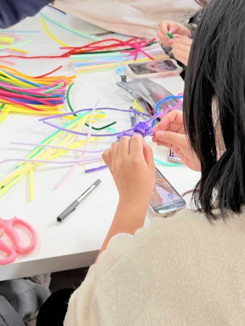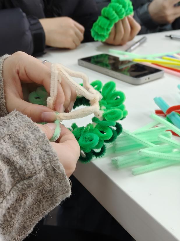此次活动通过扭扭棒手工创作的形式开展,借助扭扭棒的色彩搭配与造型创意,间接表达内心感受,替代负面情绪的压抑,实现温和的心理疏导。活动过程中,同学们通过自行挑选扭扭棒,搭配出灵动的小动物、饱满的花朵或是充满个性的挂件,把压力、焦虑等负面情绪转化为指尖可触的创意形态,最终实现“动手即疗愈”的活动效果,帮助同学们在轻松的实践中完成一次无声却有效的心理调节。