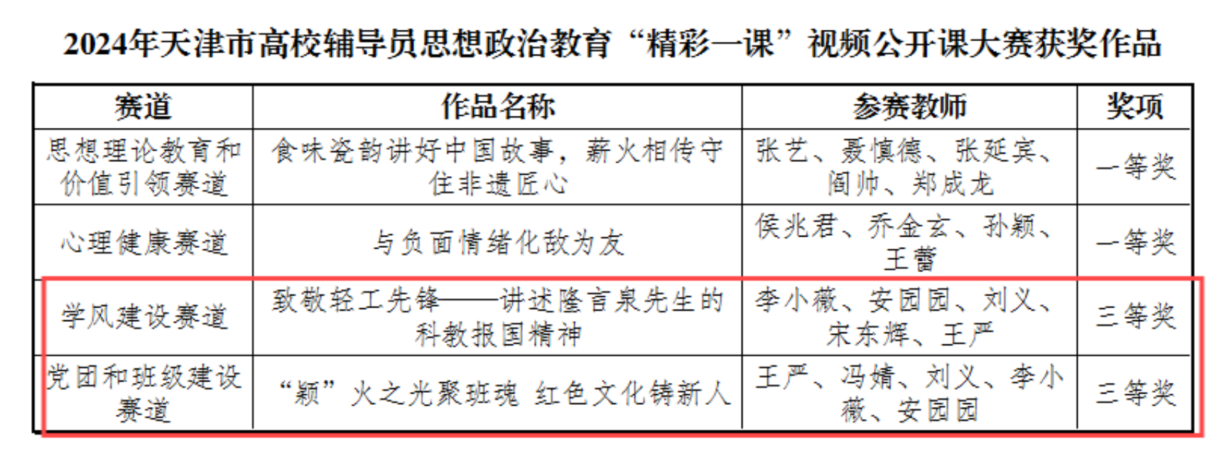近日,2024年天津市高校辅导员思想政治教育“精彩一课”视频公开课大赛结果公布,共有来自6个赛道的66个作品获奖,其中每个赛道设一等奖1项、二等奖2项、三等奖3项,优秀奖5项。轻工科学与工程学院辅导员李小薇、王严两位老师的作品分别获得学风建设赛道、党团和班级建设赛道三等奖,充分彰显出学院学生工作队伍的“先锋气派”。