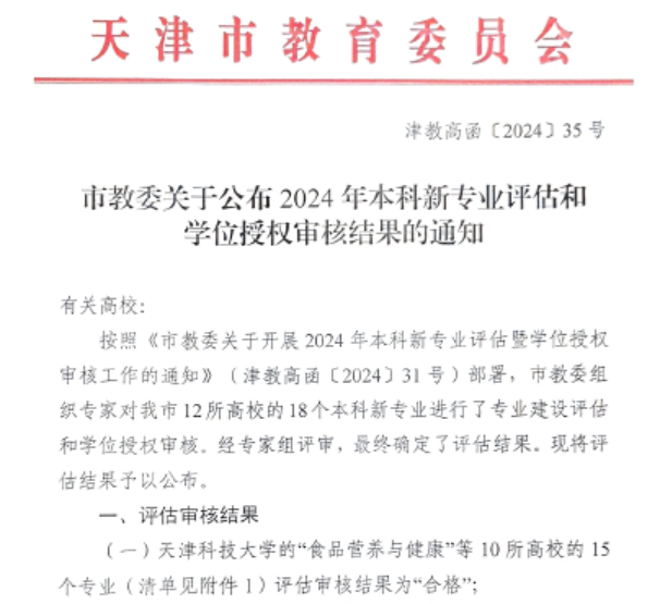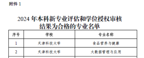 近日,天津市教育委员会公布了2024年新本科专业评估结果,我校“大数据管理与应用”和“食品营养与健康”两个专业全部通过新设本科专业评估。