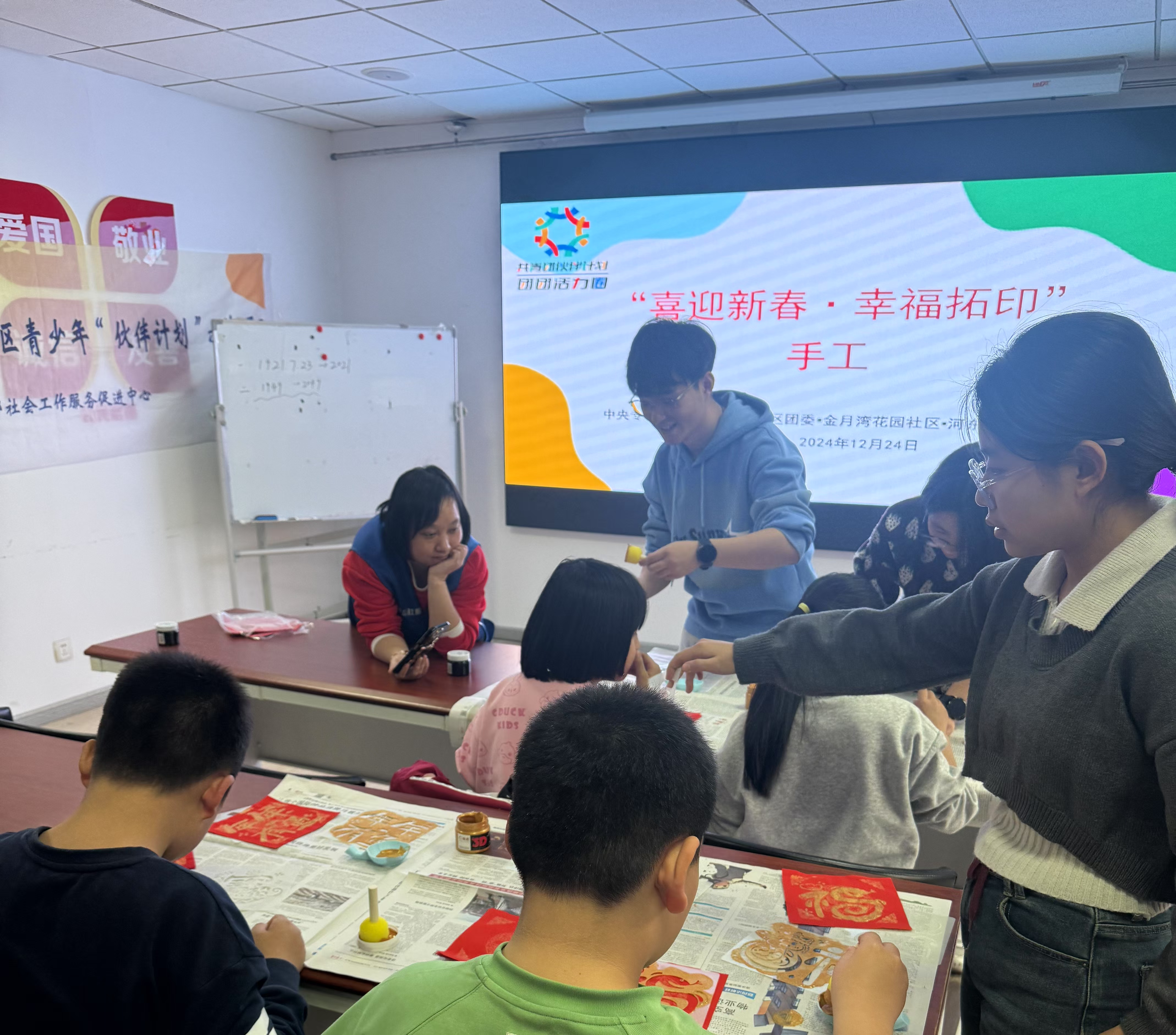 随后,社区老师带领小朋友们进行了福字拓印的手工活动,在社区老师展示了如何制作之后,小朋友们就迫不及待开始选择模板进行拓印,有象征着蛇年的图案,也有充满喜庆气息的装饰,更有不同形状的“福”字,每一种模板都蕴含着美好的祝福意义。小朋友们一边认真地制作自己的作品,一边互相交流着自己的创意和想法。 在制作过程中,小朋友们的脸上洋溢着快乐的笑容,他们小心翼翼地将红色的颜料涂抹在模板上,然后轻轻地将纸张覆盖在上面,用手轻轻按压,确保每一个细节都能清晰地拓印出来。随着时间的推移,一张张充满喜庆气息的福字作品逐渐成形,小朋友们的脸上露出了满足和自豪的表情。
